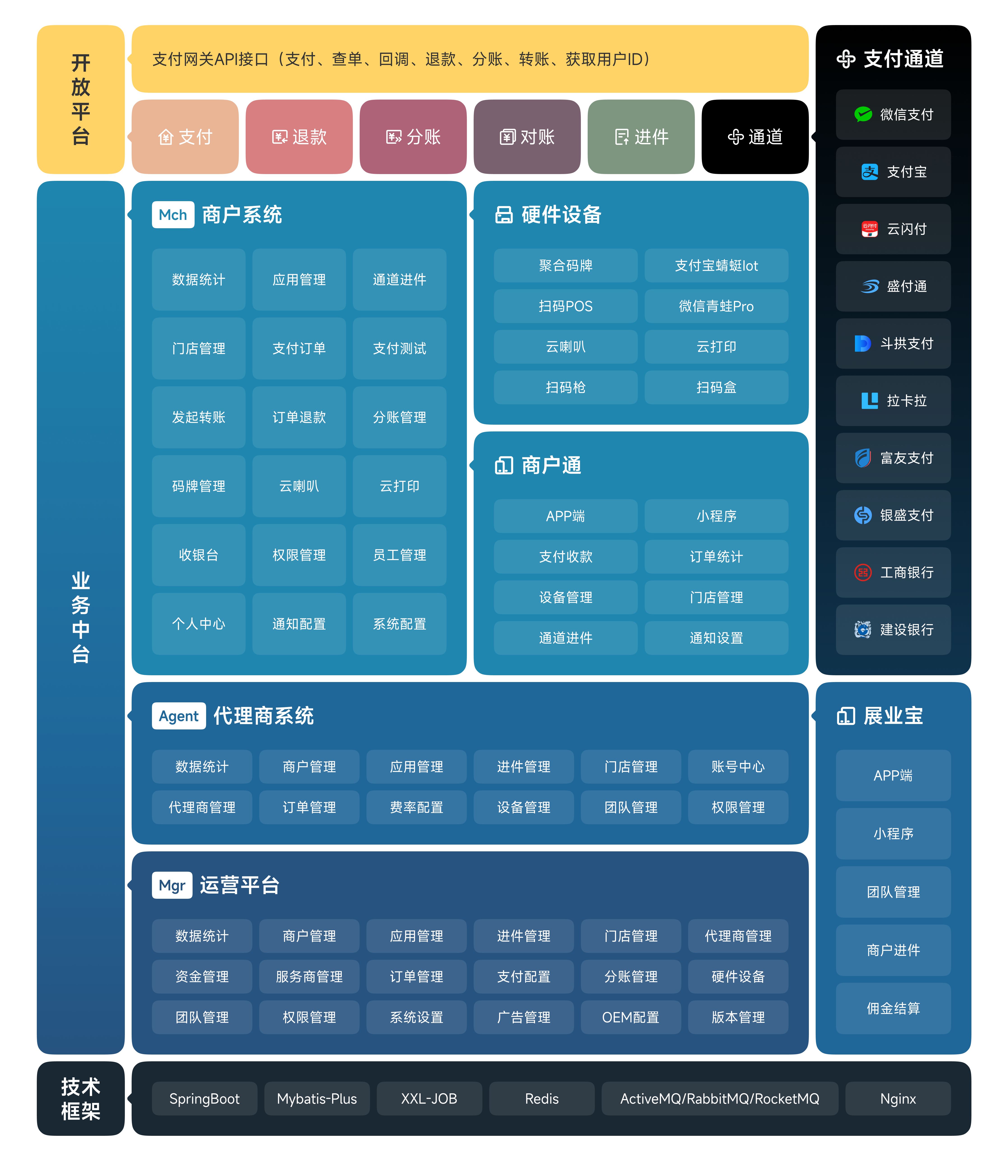 目录 搜索 1. 系统介绍系统架构功能列表商家收款硬件设备系统演示对比安付捷开源版对比小新支付商业版已接支付渠道已接硬件厂商2. 开发部署技术框架数据库功能开发通道对接短信厂商对接设备对接UI规范系统部署移动端部署商户通展业宝聚合码刷脸小程序3. 系统使用系统配置支付配置码牌配置硬件设备如意Lite广告管理会员功能4. 系统设计对账流程智能POS对接智能POS对接说明已对接支付渠道汇付天下盛付通富友支付随行付银盛支付嘉联支付拉卡拉汇拓客云打印机智网云打印易联云打印收银插件小精灵银联PID改造5. 运营指导部署发布配置使用常见问题收银台本地调试unipush2.0 推送排查支付渠道渠道手册一览微信支付官方支付宝官方盛付通河马付嘉联支付首信易互联互通网联客银盛支付斗拱支付通联支付联动惠商联动优势易生支付拉卡拉汇拓客新生支付随行付直付通交行支付瑞银信国通星驿海科融通易宝支付泸州银行 暂无相关搜索结果! 本文档由 安付捷科技 发布 安付捷支付Safe and Quick S3系统架构文档更新时间: 2026-02 作者:LK