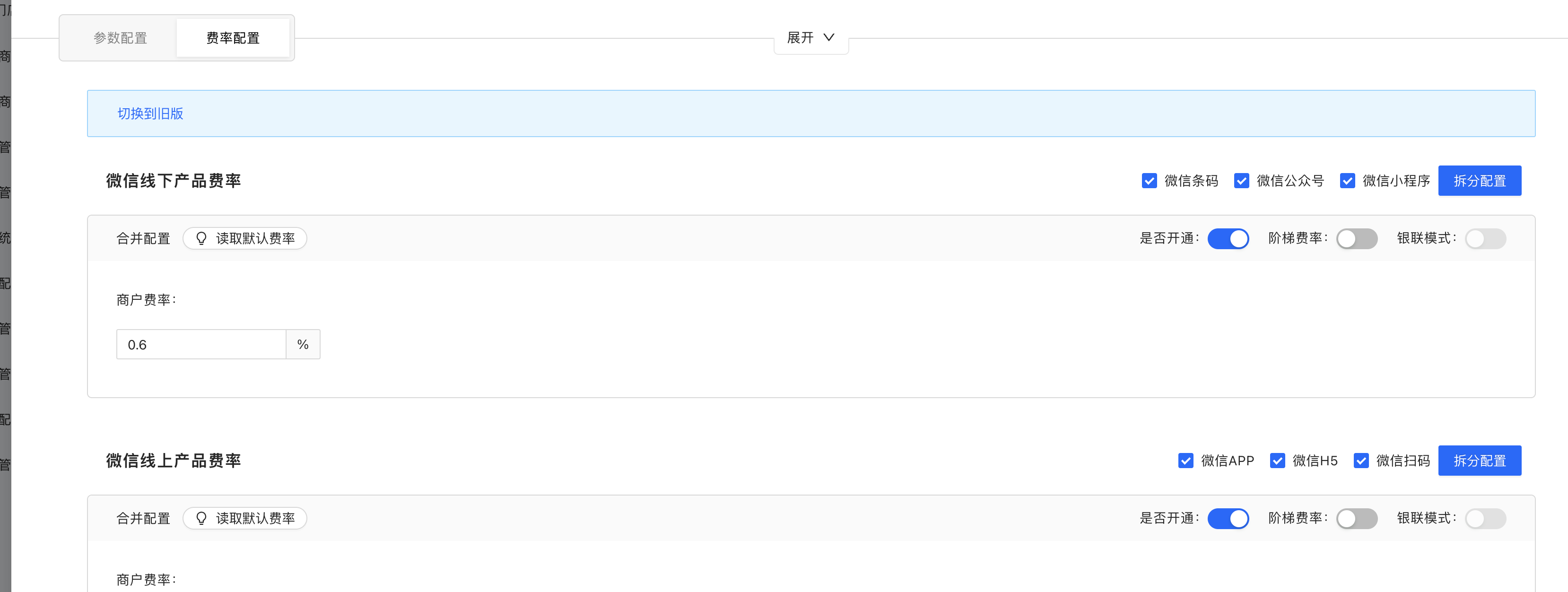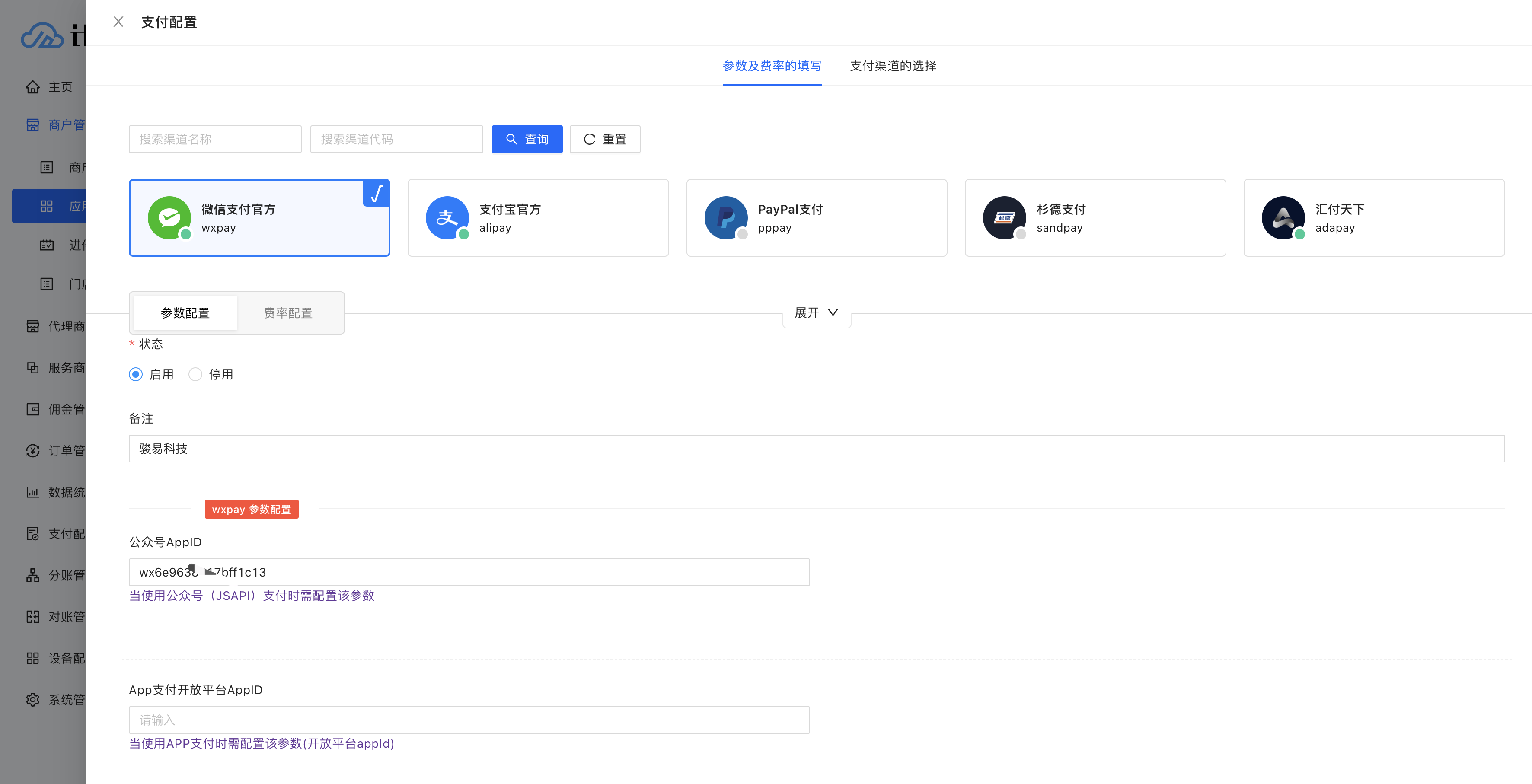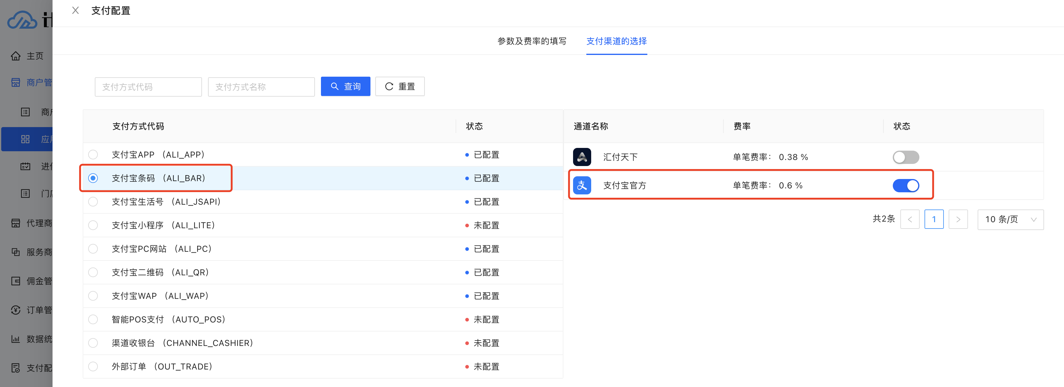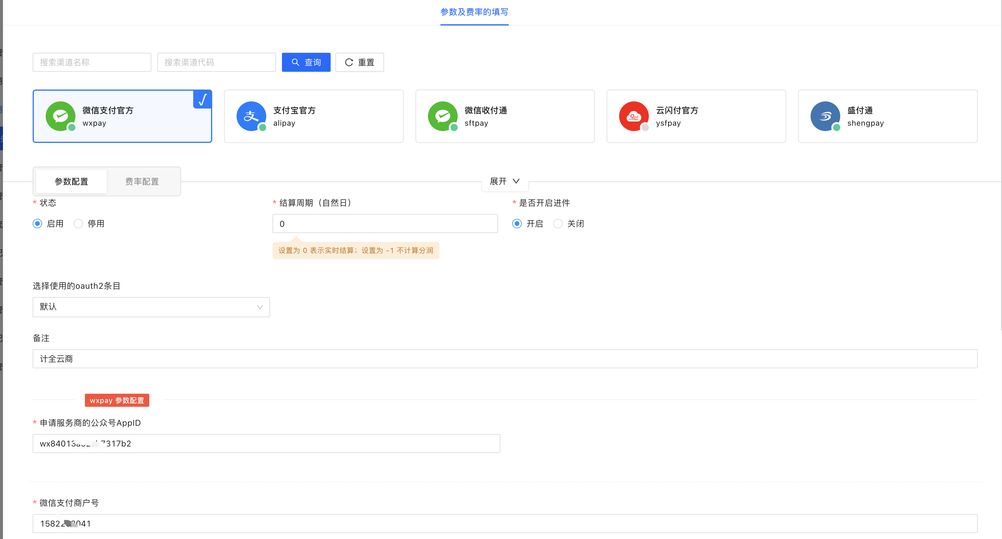 配置好参数和费率后,需要设置每个支付方式对应的支付渠道。