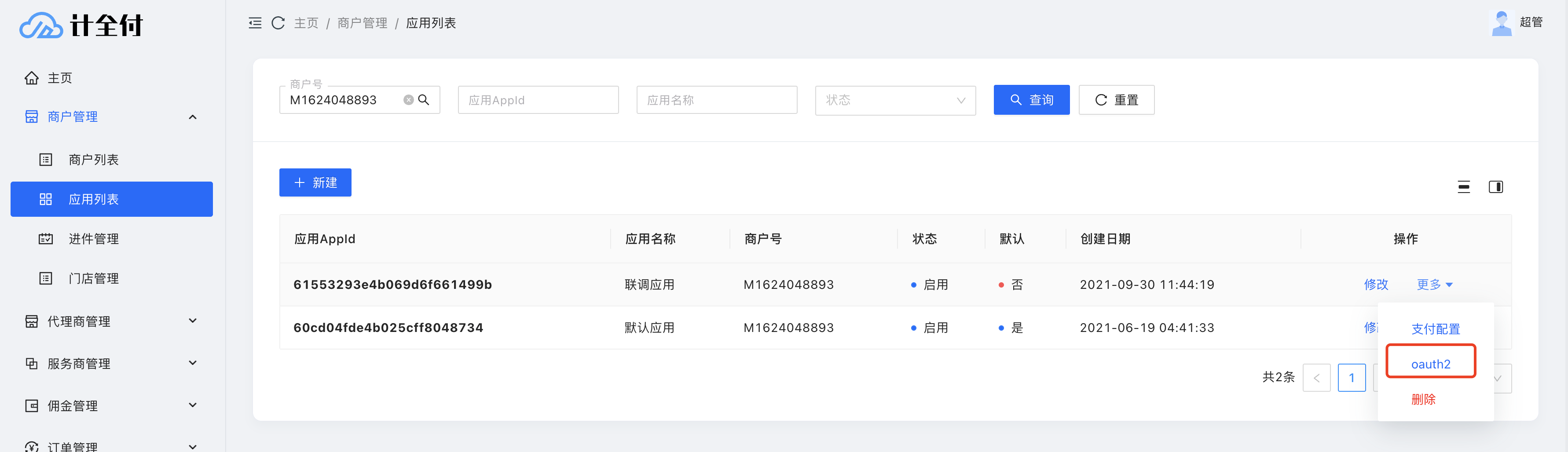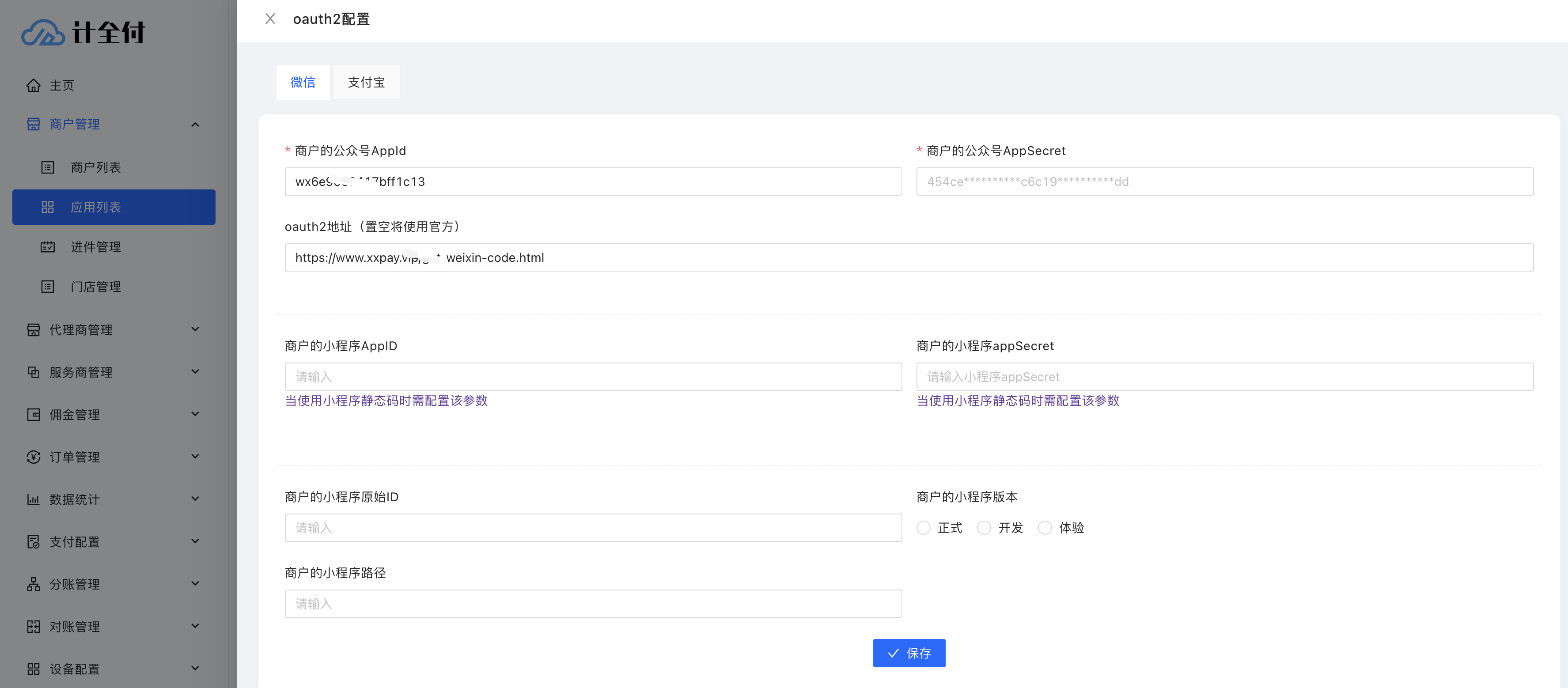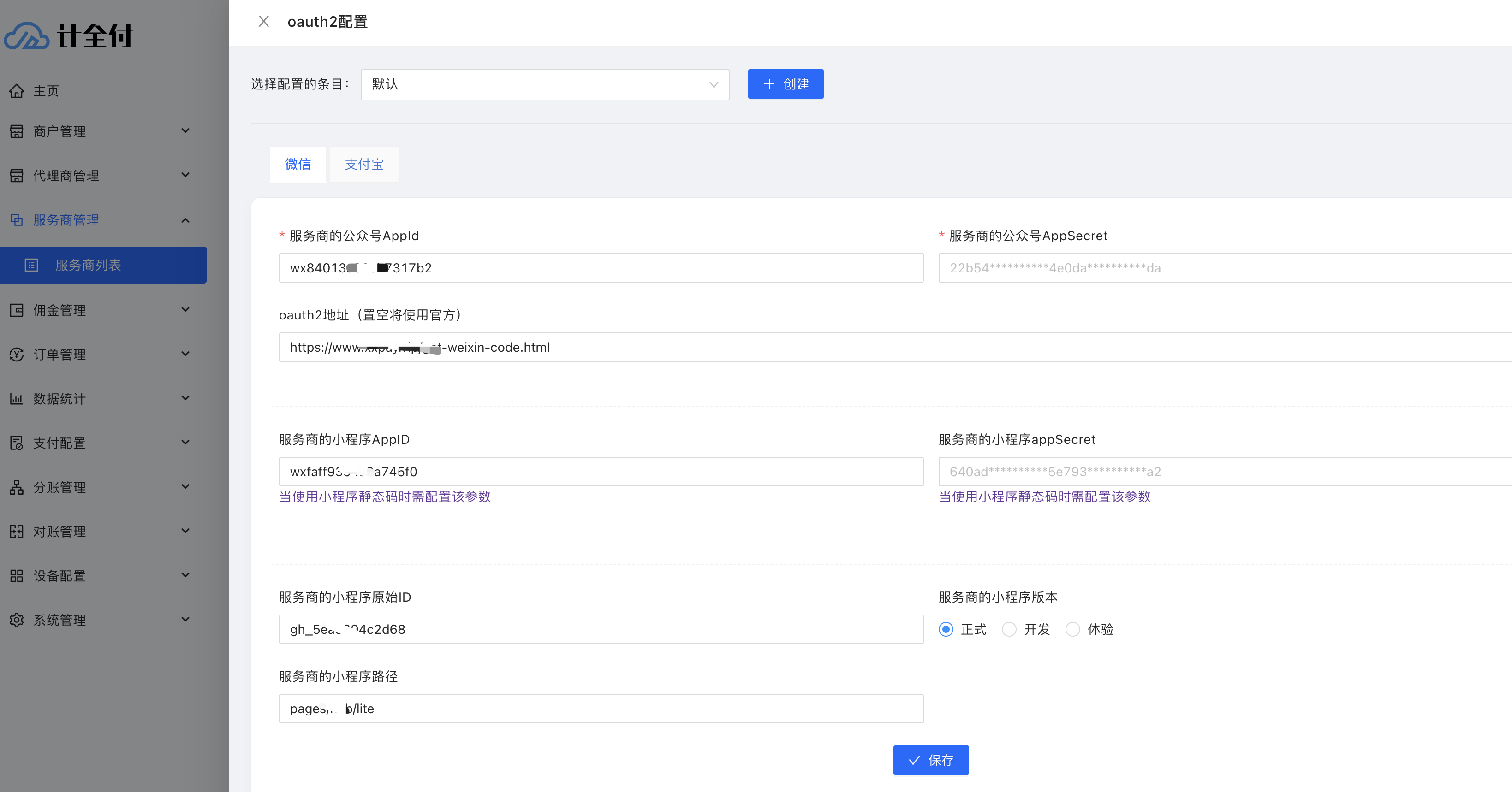 通过配置oatuh2,可以设置服务商的微信和支付宝参数。