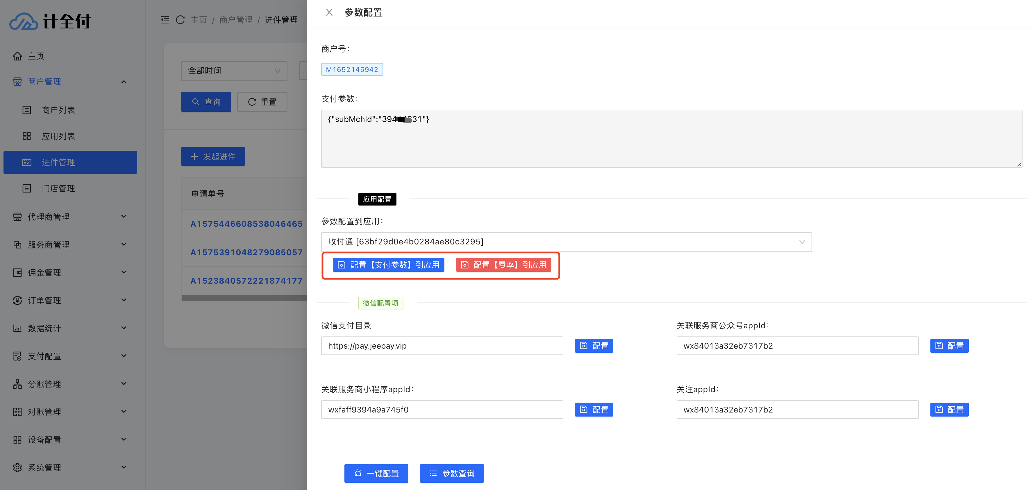 进件成功后,通过参数配置,将支付渠道返回的商户支付参数配置到应用。