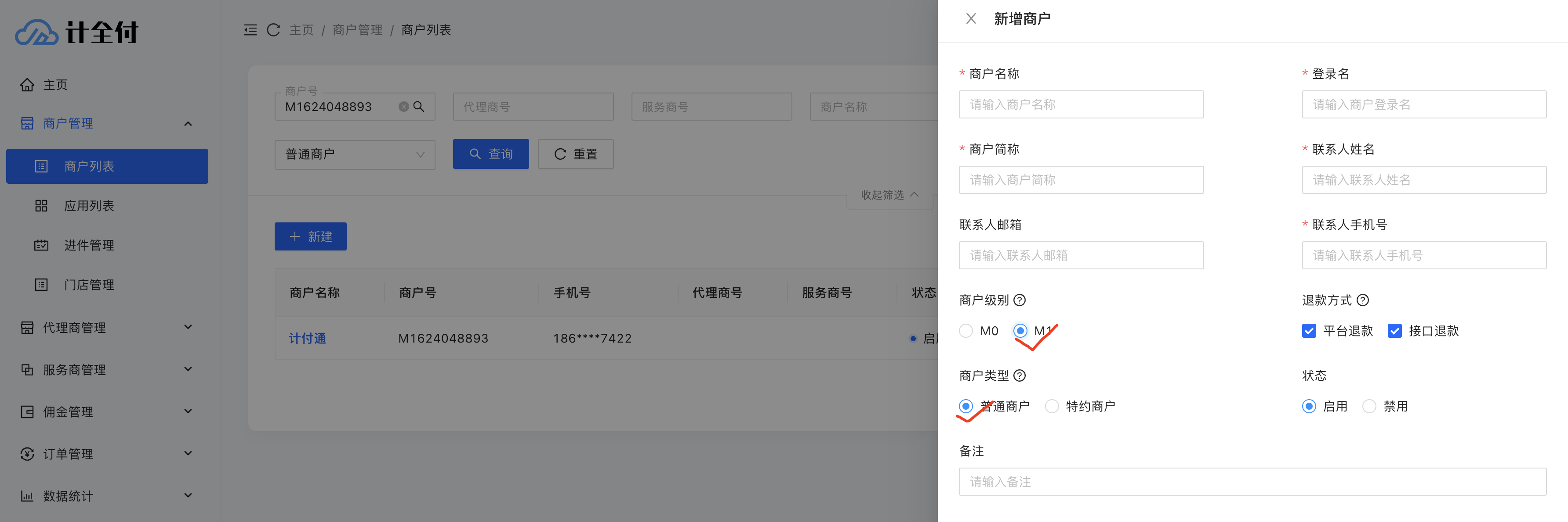 如果商户看不到支付测试入口,需要进入 【商户系统 - 系统管理 - 系统配置 - 功能配置】修改商户等级M1,然后退出重新登录。