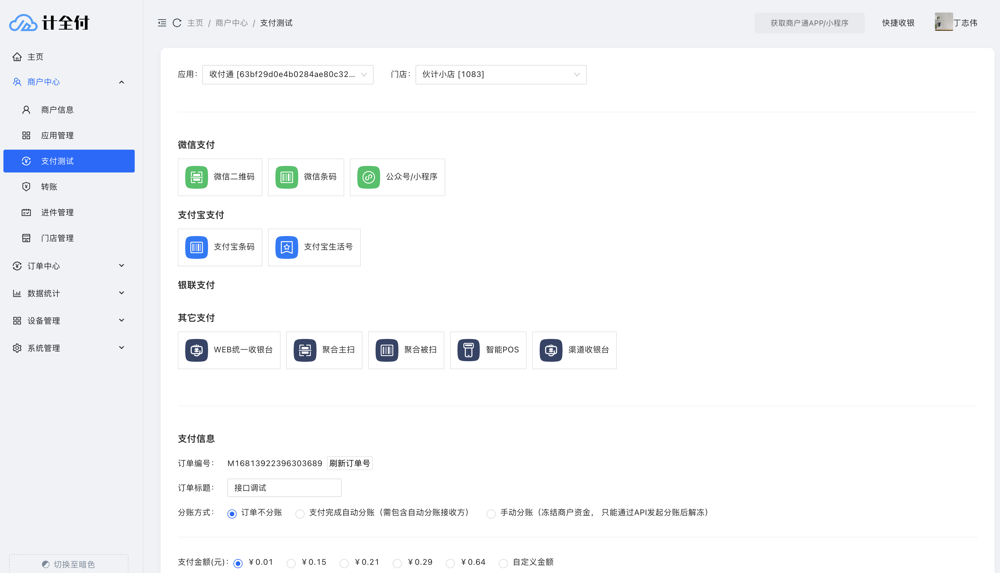 登录商户系统,进入商户中心-支付测试,可以测试支付流程。