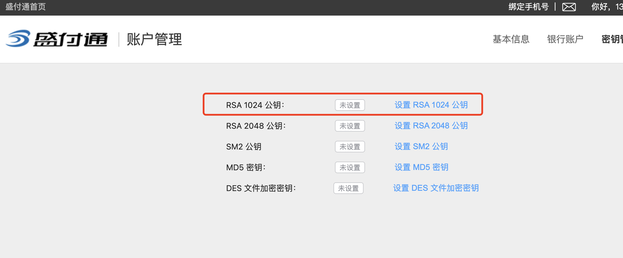 进入盛付通服务商平台,设置设置 RSA 1024 公钥:https://b.shengpay.com/user.html#/account/key-management
