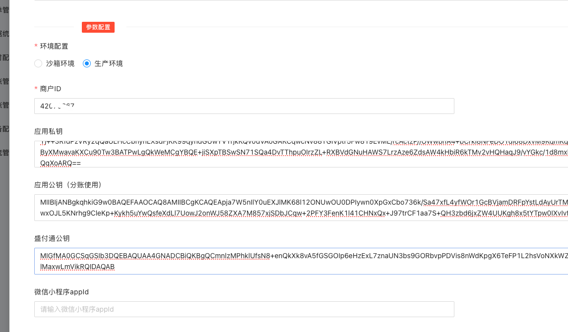 上面配置中的应用公钥(分账使用),配置我方应用公钥即可。由于盛付通分账需要设置每个商户的公钥,所以这里采用了所有分账商户使用服务商的统一配置。