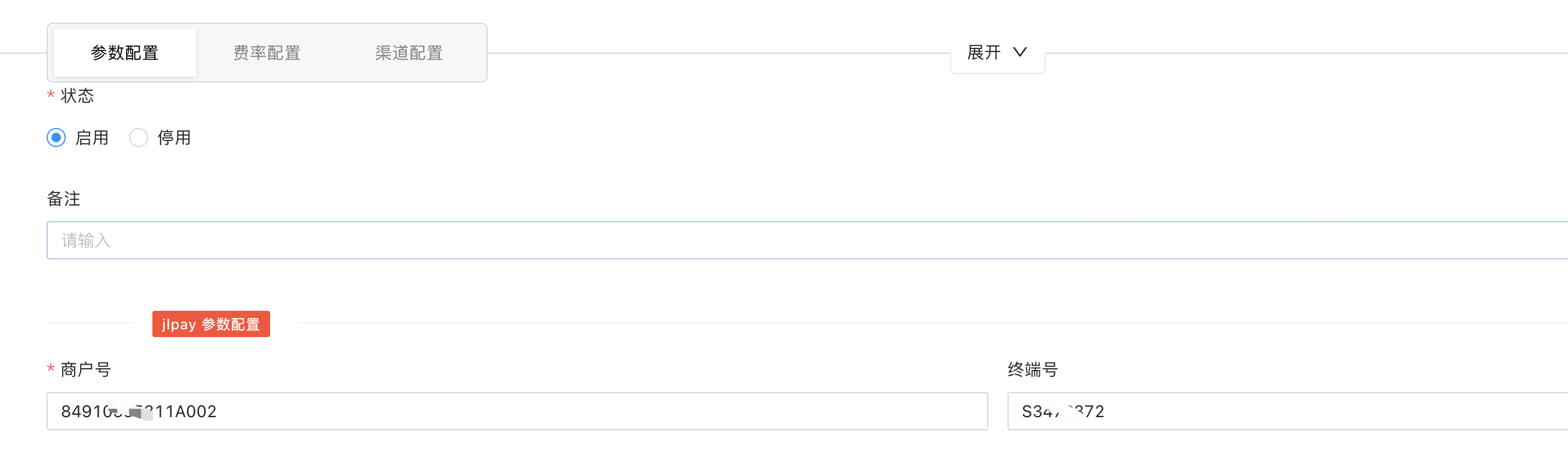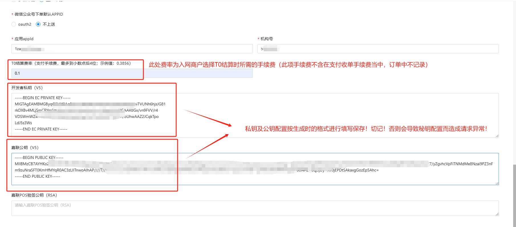 - 参数配置注意事项:如下图配置示例,进件参数sm2参数,不做处理,生成的参数原样配置即可