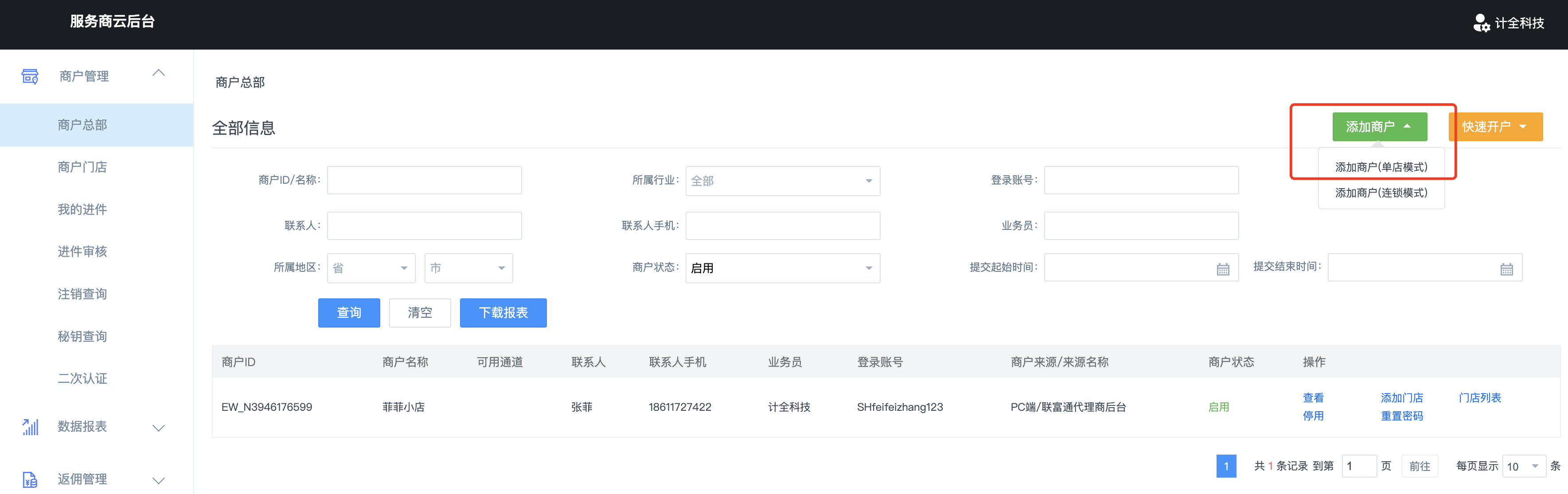 登录小精灵服务商云后台:http://ms.liantuobank.com/ ,添加商户。