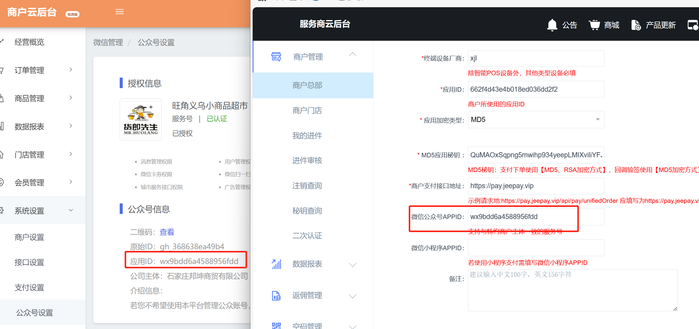 此处商家授权的公众号appid与安付捷支付通道配置参数的appid要一致,同时在安付捷支付通道侧,要将该商户在服务商下入网开户。