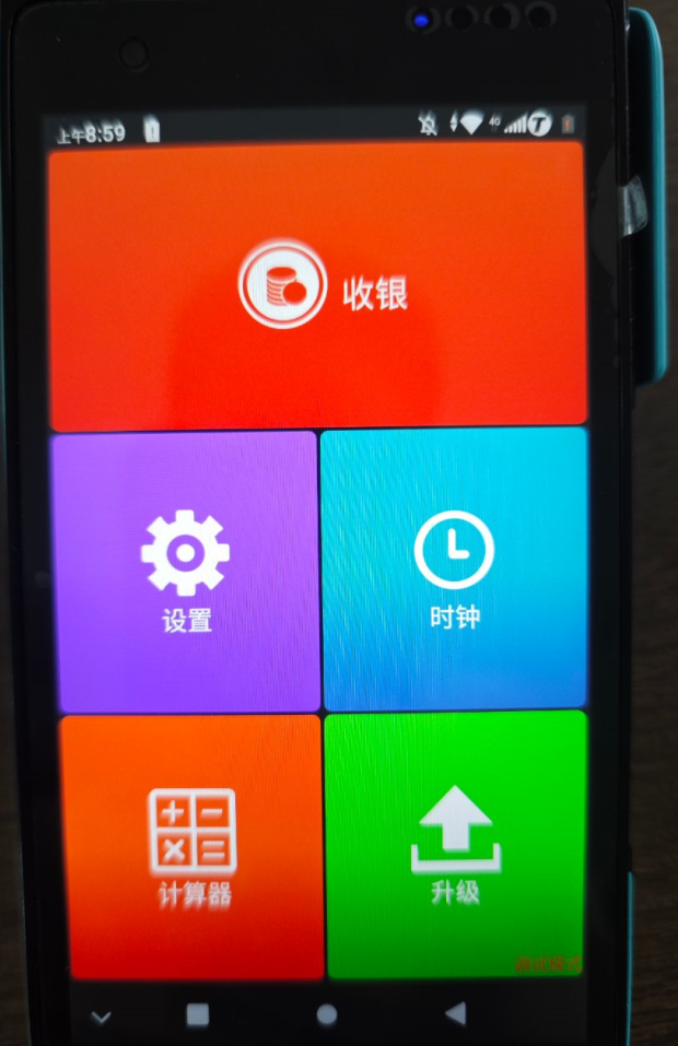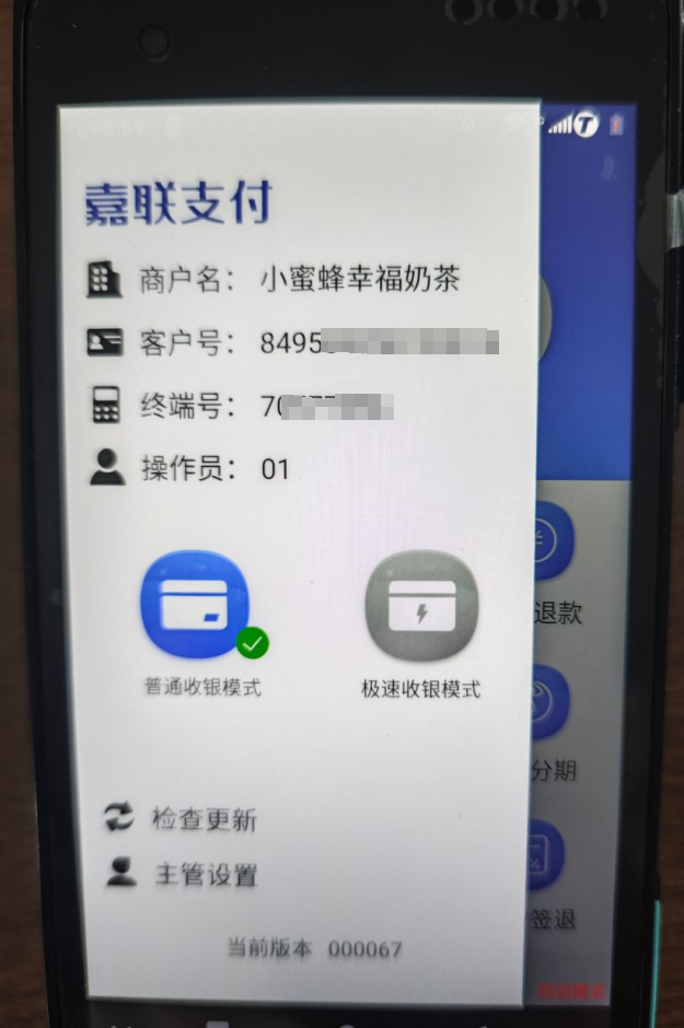 签到成功后显示收银主页面,点击左上角显示设备信息即可看到终端号。