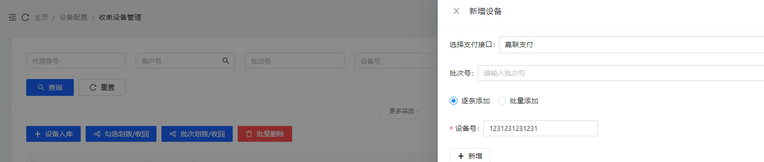 登录安付捷支付 - 运营平台,进入【设备配置 - 智能POS管理】,将智能POS入库。(如果支付接口列表中没有嘉联渠道,可先检查在支付配置-支付接口中勾选智能POS支付方式)