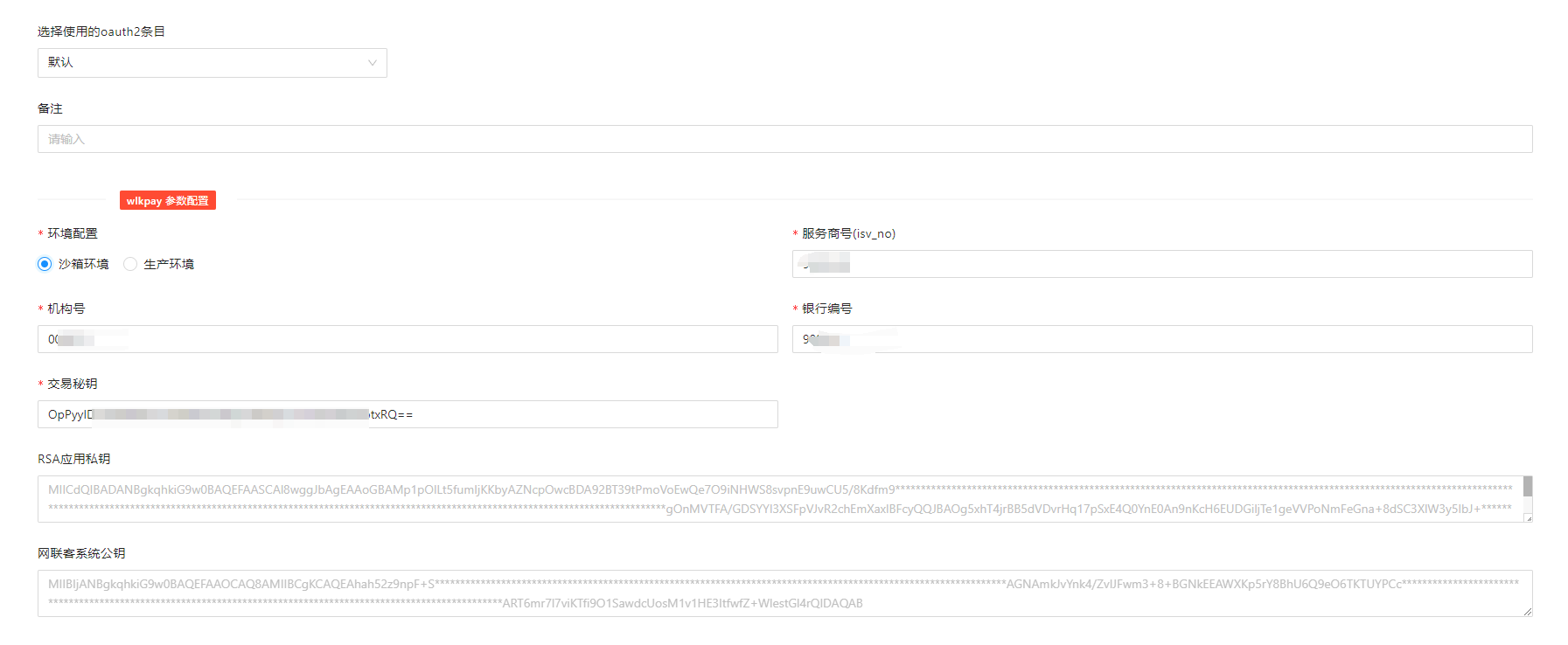 - 服务商号(isv_no)、机构号、银行编号、交易秘钥联系支付公司获取