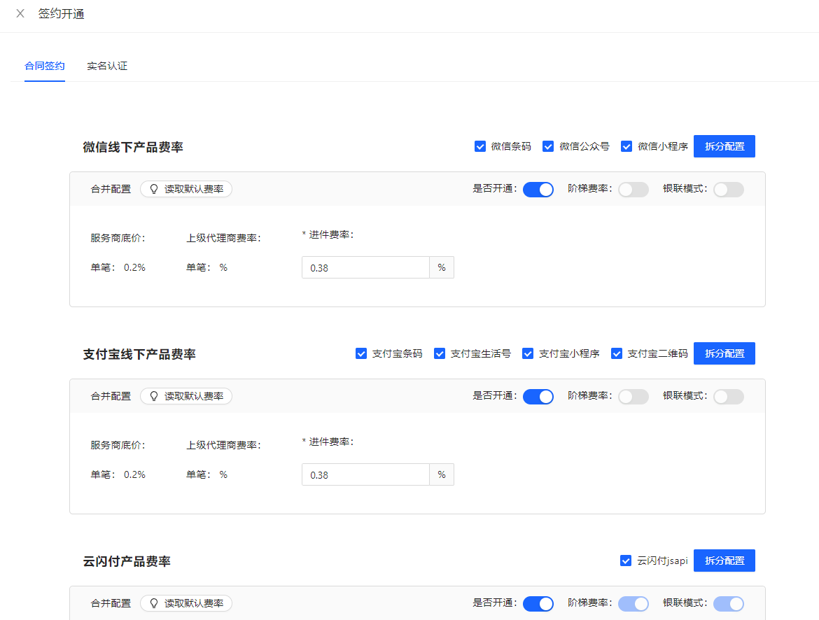 <进件成功>状态下请开始操作下一步,依旧打开签约开通页面,此时会展示费率相关配置(默认读取为入驻资料填写的费率)