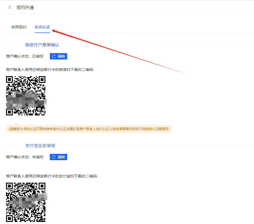 打开实名认证页,入驻商户使用支付宝、微信扫码实名认证