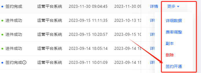 - 发起进件后进件记录状态为<签约完成>,此时需操作签约开通页面。