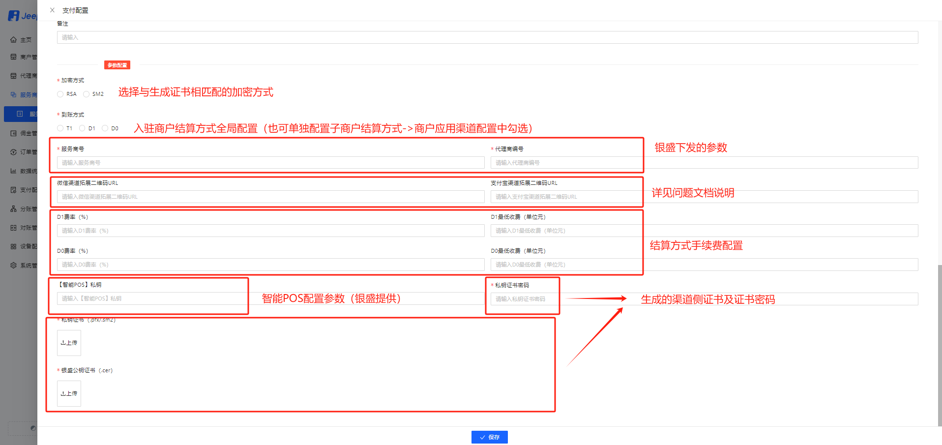 - 按银盛文档说明/对接人员沟通生成对应的签名公私钥,按如下配置,配置到服务商参数中
