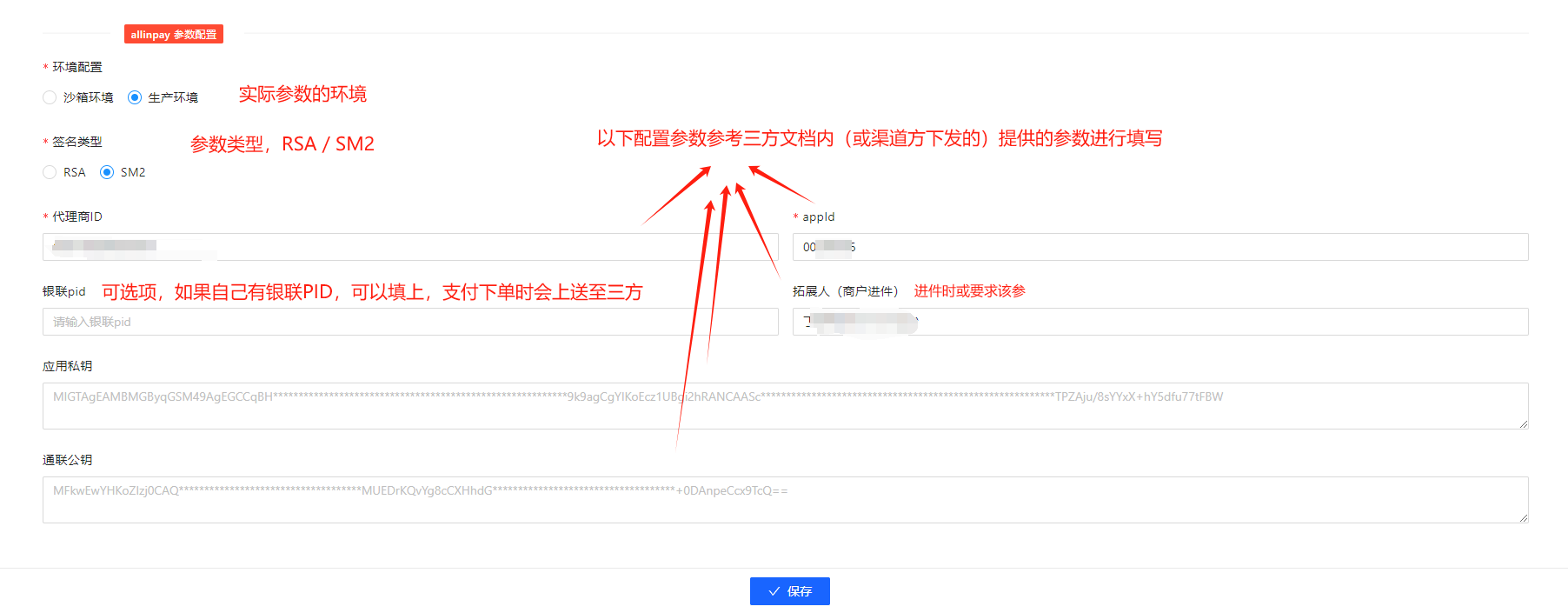 - 按渠道文档说明/对接人员沟通生成对应的签名公私钥,按如下配置,配置到服务商参数中