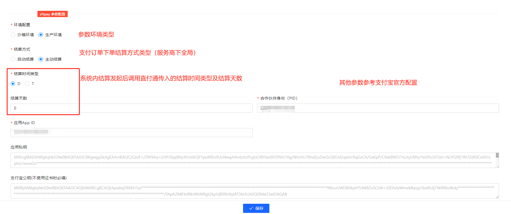 支付宝直付通安付捷配置进件说明支付宝直付通对接文档:文档地址 上述渠道对接文档包含了服务商入驻,测试调试参数,支付&进件对接安付捷配置 按渠道文档说明/对接人员沟通生成对应的签名公私钥,按如下配置,配置到服务商参数中进件说明 状态流转:发起进件 -> 等待审核结果 -> 进件成功 进件完成后需手动配置费率及开启支付方式,具体手动配置请参考:支付配置文档文档更新时间: 2026-02 作者:LK