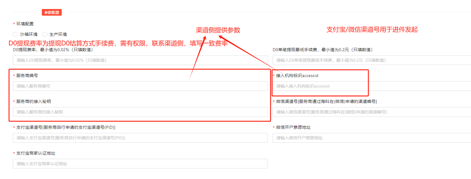 - 按渠道文档说明/对接人员沟通生成对应的签名公私钥,按如下配置,配置到服务商参数中