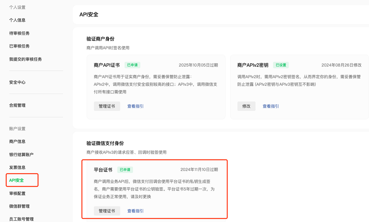 一般微信客服人员会联系,或者在微信支付后台 > API安全 > 平台证书。