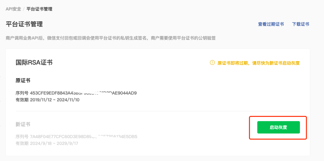 替换后,再回到微信支付平台,启动灰度发布100%,然后回到jeepay测试支付交易是否正常即可。